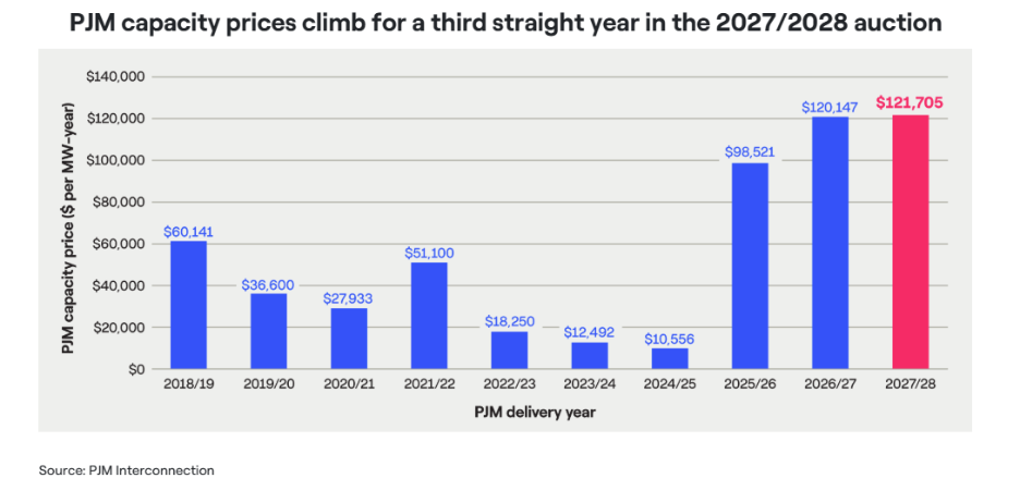The 2027/2028 Base Residual Auction is the first auction in which the entire RTO fell short of the reliability requirement. This latest auction leaves no doubt that data centers' demand for electricity continues to far outweigh new supply.